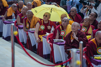 Former and present abbots of Tibetan Monasteries listening to His Holiness the Dalai Lama speaking at the inauguration ceremony for the new Tashi Lhunpo Monastery Assembly Hall in Bylakuppe, Karnataka, India on December 19, 2015. Photo/Tenzin Choejor/OHHDL