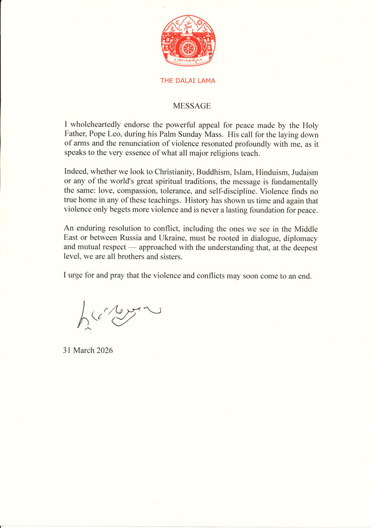 I wholeheartedly endorse the powerful appeal for peace made by the Holy Father, Pope Leo, during his Palm Sunday Mass. His call for the laying down of arms and the renunciation of violence resonated profoundly with me, as it speaks to the very essence of what all major religions teach.