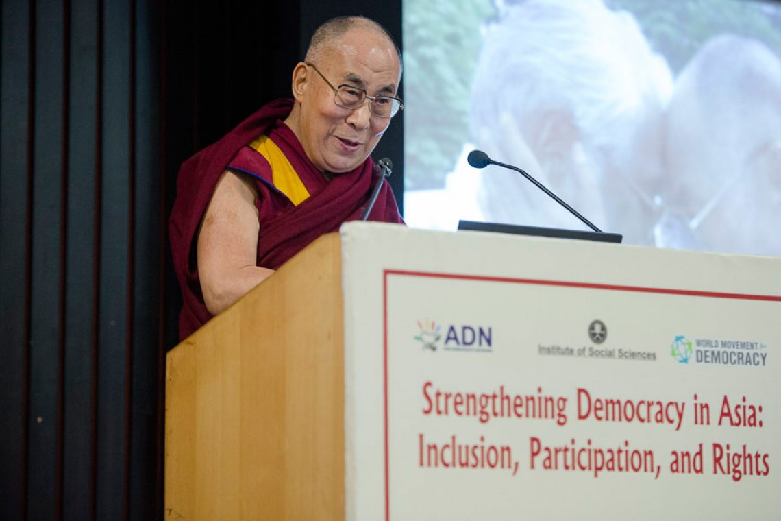 His Holiness the Dalai Lama speaking at the National Endowment for Democracy's conference on 'Strengthening Democracy in Asia' at the India International Centre in New Delhi, India on March 23, 2015. Photo/Tenzin Choejor/OHHDL