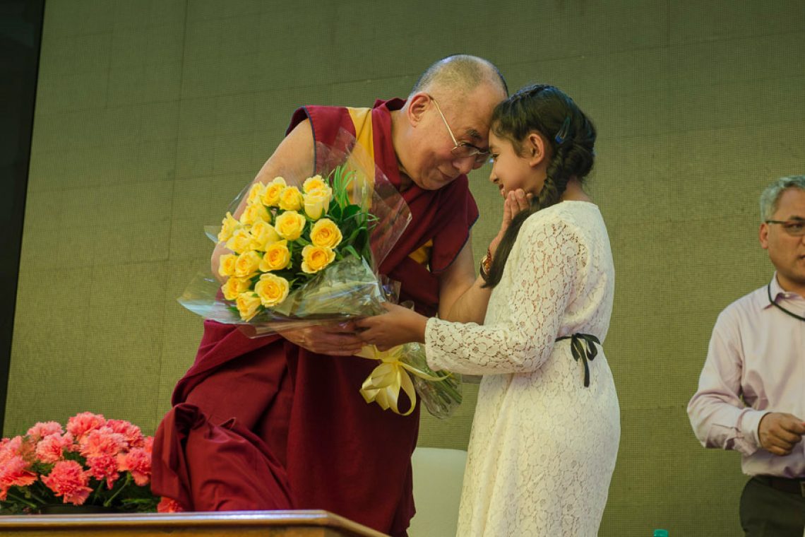 His Holiness the Dalai Lama is welcomed with flowers before his talk at the Gymkhana Club governing body in New Delhi, India on March 23, 2015. Photo/Tenzin Choejor/OHHDL