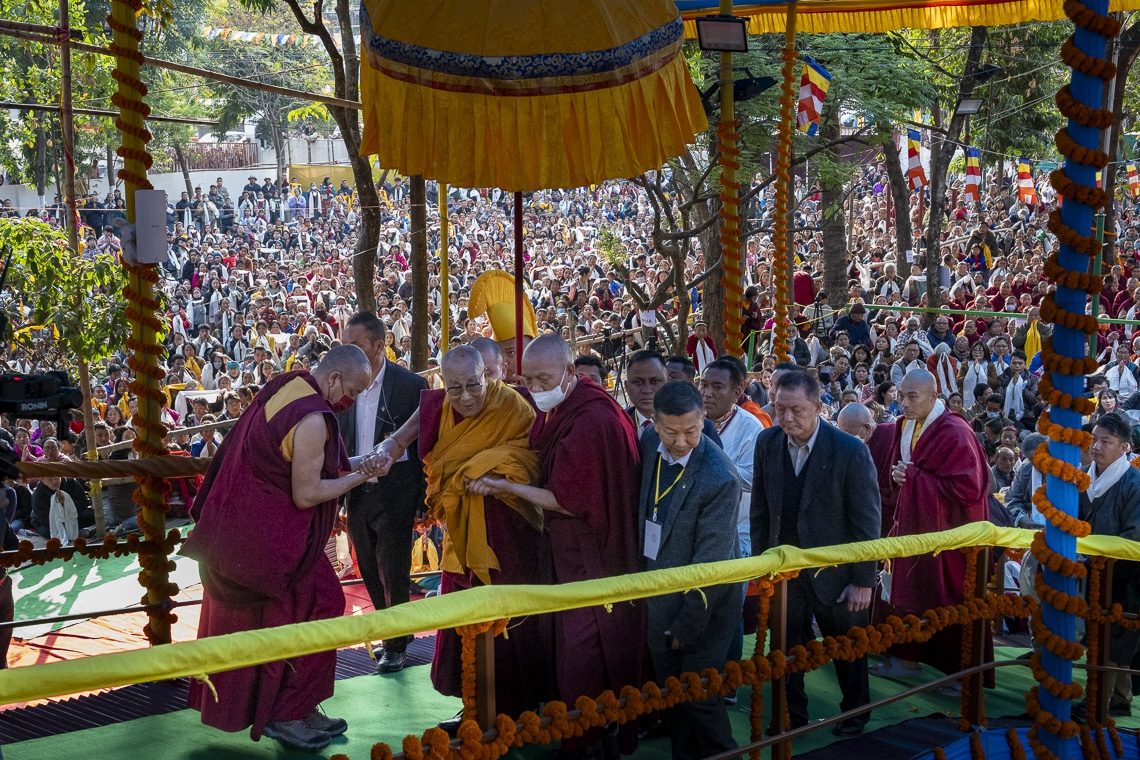 Khenpo Wangdu of Sed-Gyued Monastery greeting His Holiness the Dalai Lama during the welcome ceremony at Sed-Gyue Monastery in Salugara, West Bengal, India on December 14, 2023. Photo by Tenzin Choejor