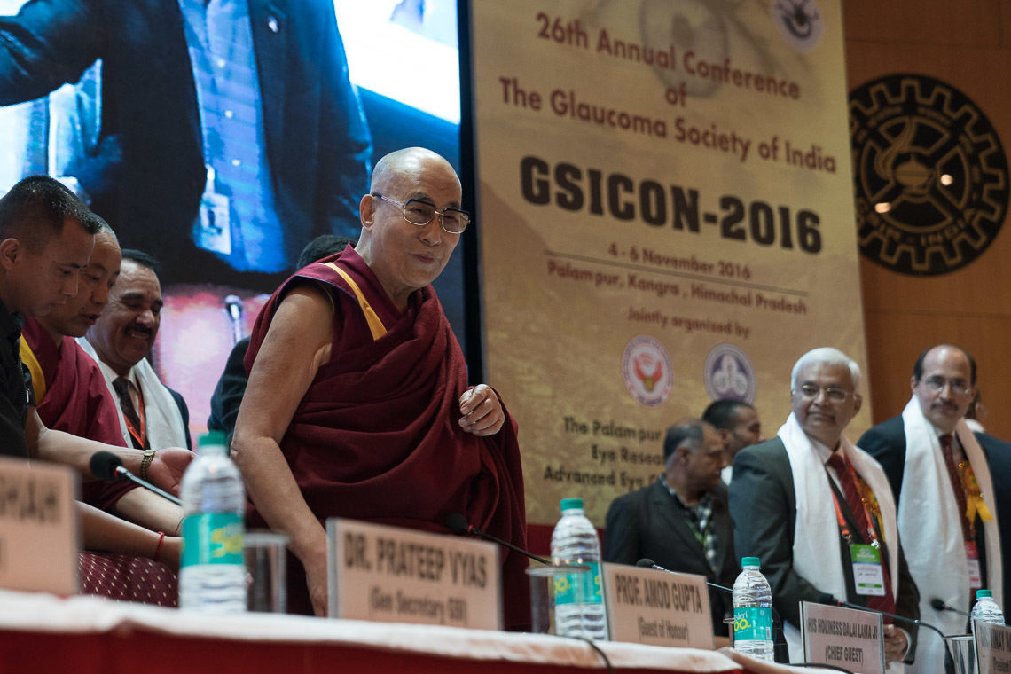 His Holiness the Dalai Lama addressing the 26th Annual Conference of the Glaucoma Society of India in Palampur, HP, India on November 5, 2016. Photo/Tenzin Choejor/OHHDL